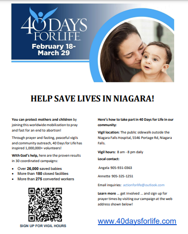 Prayer vigil outside the Niagara Falls hospital: Portage Street and North Street. The vigil will run from 8 am to 8 pm for 40 days, beginning on Wednesday, February 18 at 3:30PM with Opening Prayers and Blessing and ending on Sunday, April 13. Register or find more information here. There will be free parking all day at the St. Ann Adult Education Centre, 5895 North Street, Niagara Falls, ON. Also, there are a few free spots along North Street.